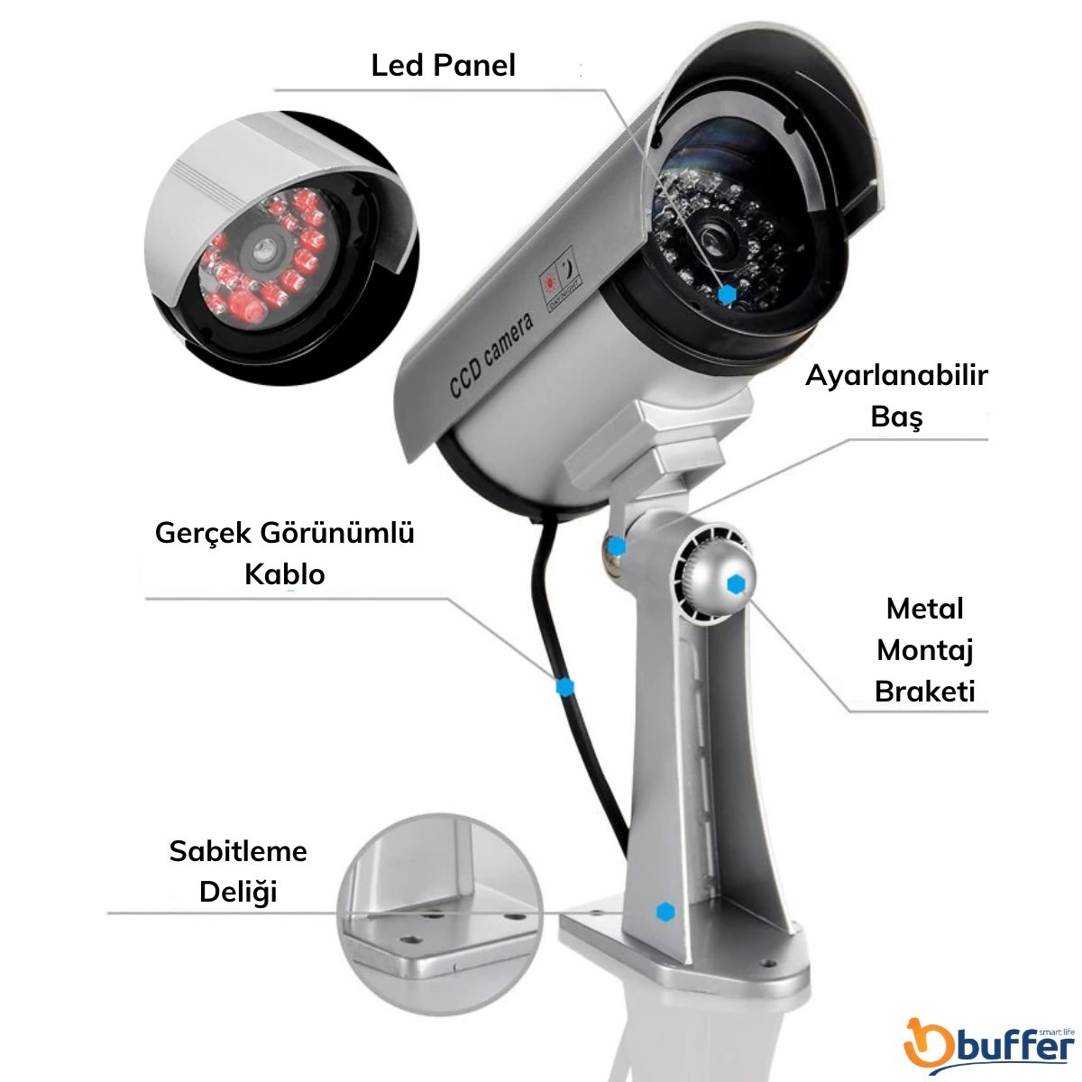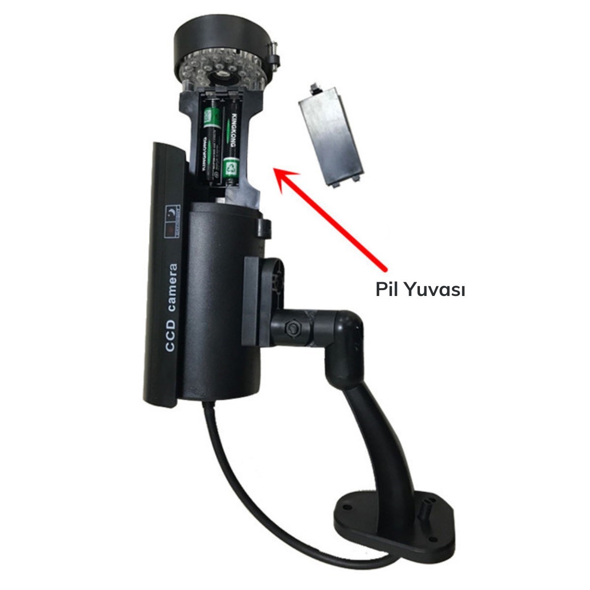 Üzerindeki çoklu sahte kızıl ötesi led ışık ışığı her 5 saniyede bir yanıp söner ve geceleri görebileceği görünümü verir Sahte video kablosu kameranın bir kamera kayıt cihazına bağlı olduğu görüntüsü verir
