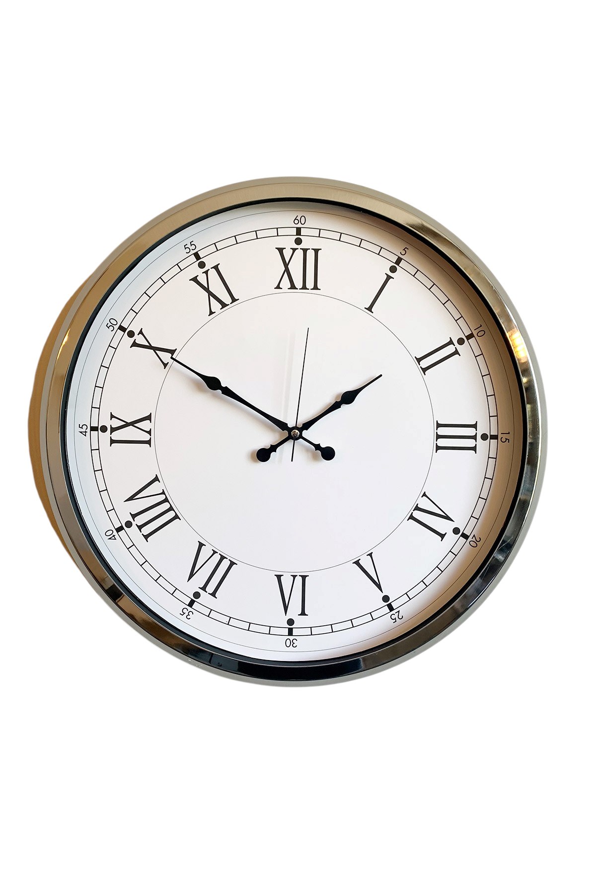 Modern tasarımın sade şıklığını bir araya getiren bu 52 x 52 cm büyük boy duvar saati, dekoratif görünümü ve kaliteli malzemesiyle ev ve iş yerlerinde zamana estetik bir dokunuş kazandırır. Parlak krom çerçevesi, minimal kadranı ve net rakamlarıyla özellikle geniş duvarlarda oldukça dikkat çeker.