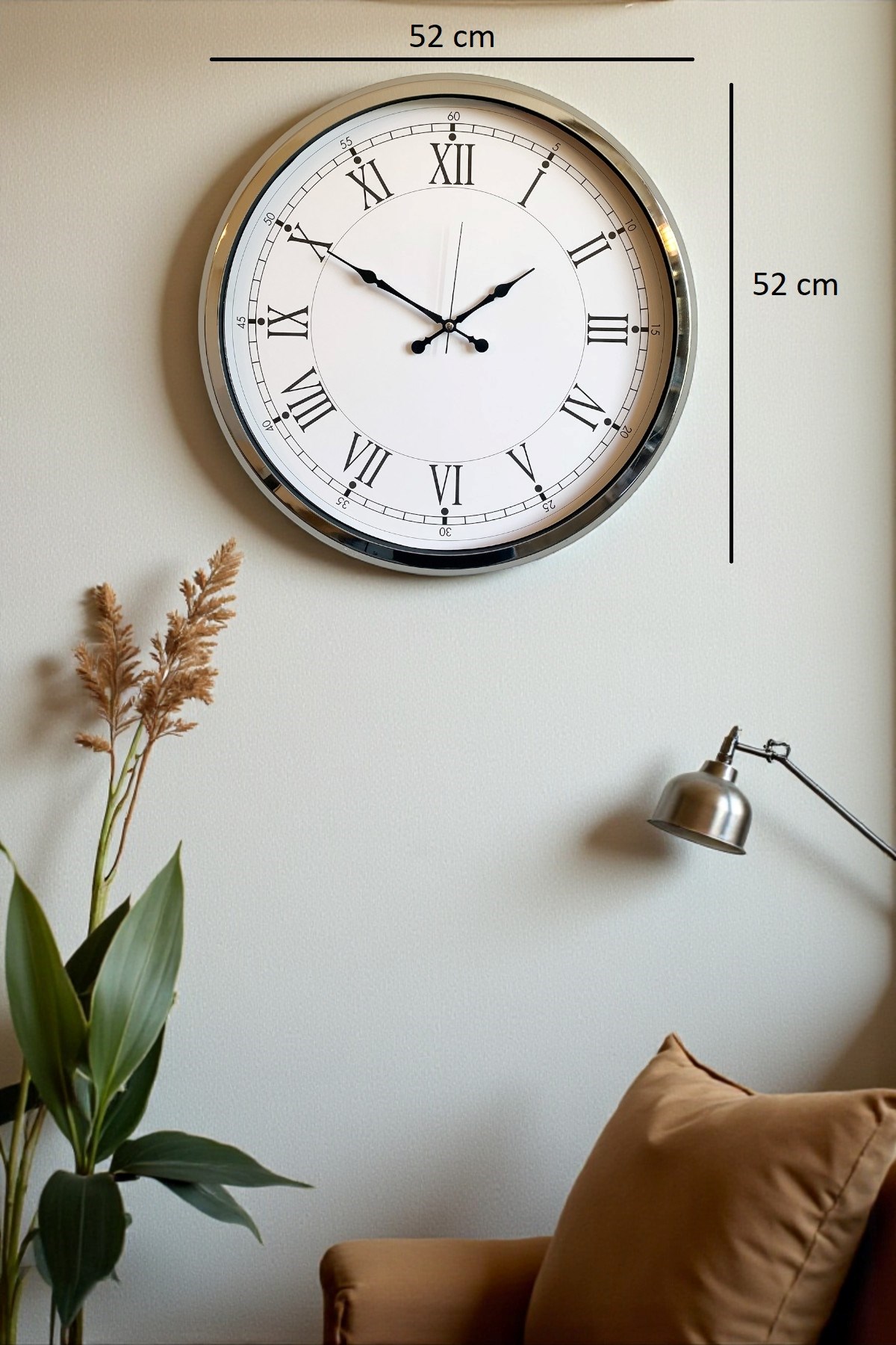 Krom çerçevenin şık parlaklığı, modern, minimalist, klasik veya lüks dekorasyon tarzlarının tümüne kolayca uyum sağlar. Ürün hafif yapısı sayesinde duvara monte etmek çok kolaydır. 52 cm genişliği ile büyük duvar saatleri kategorisinde yer alır ve bulunduğu alana premium bir görünüm kazandırır.